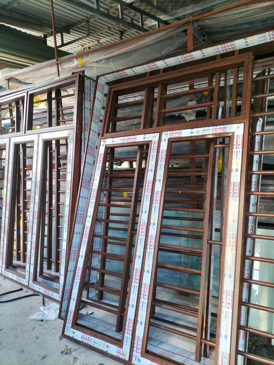 Là khung nhôm vân gỗ được lắp ghép hoàn chỉnh, bo kín xung quanh, sẵn sàng lắp kính hoặc lắp thêm cánh mở trượt.
